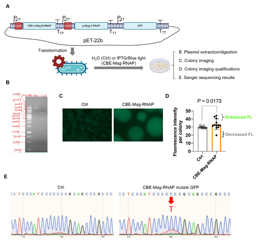 Figure2. Verification of the second-generation black box’s success. A, Plasmid of the second-generation black box (CBE-Mag-RNAP). B, Agarose gel electrophoresis result of the plasmid of the second-generation black box (CBE-Mag-RNAP). C, Fluorescence microscopy results of the experimental group and the control group. D, The GFP fluorescence intensity of the experimental group and the control group. E, Sequencing results of the experimental group and the control group.
