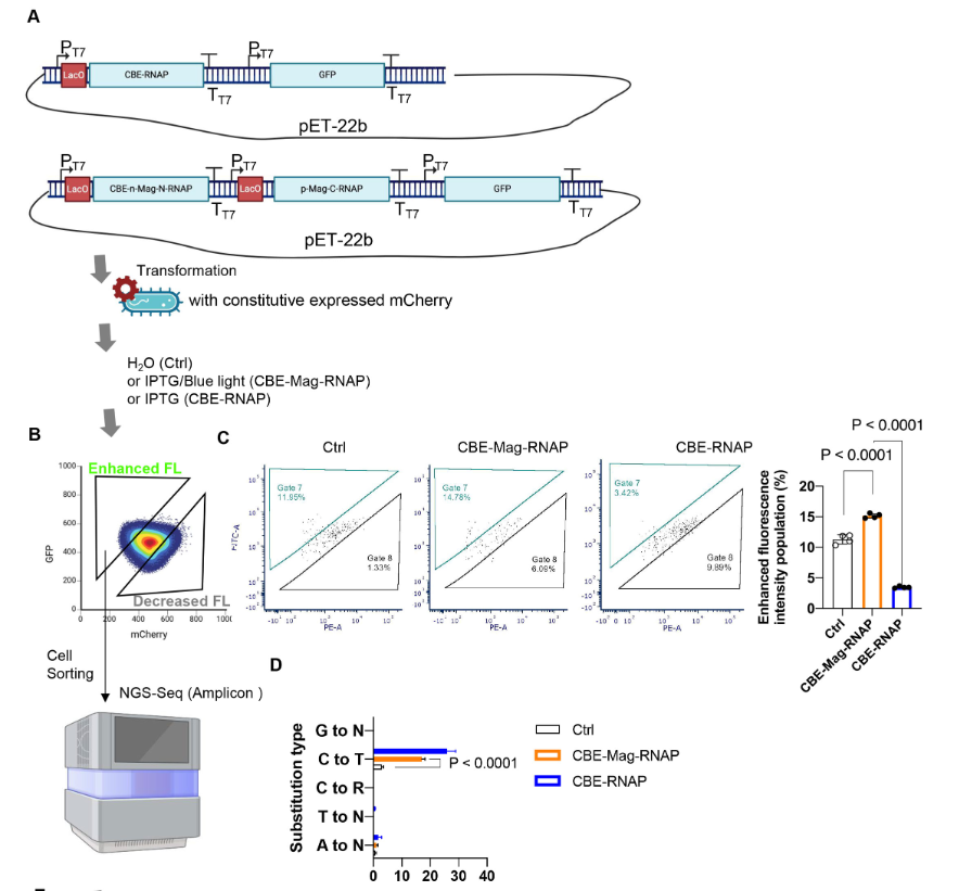 Figure3. Differences in mutation frequencies caused by the second-generation black box (CBE-Mag-RNAP) and the first-generation black box (CBE-RNAP). A, Plasmids of the second-generation black box and the first-generation black box. B, Fluorescence-activated cell sorting (FACS) based on the fluorescence intensities of GFP and mCherry. C, Proportion of cells with increased and decreased fluorescence intensity in the three groups. D, Statistical analysis of the proportions of different types of random mutations. E, Schematics of the mutated GFP T10I, S29F, A155V . Gray part refers to the wild type while green part refers to the mutant.