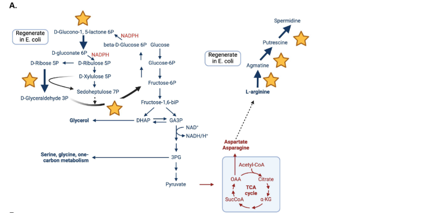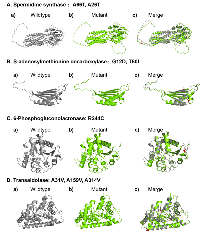 To further explain the reasons for mutations that can provide evidence for the production of more NADPH and spermidine, we performed protein structure analysis on each mutation detected through next-generation sequencing. As shown in Figure 5A, the mutations A66T and A26T in spermidine synthase may enhance the efficiency of converting putrescine to spermidine. Considering systems biology, the A66T and A26T mutations in spermidine synthase, along with the G12D and T60I mutations in S-adenosylmethionine decarboxylase, can collectively support the entire metabolic system in generating more spermidine. More importantly, the R244C mutation in 6-phosphogluconolactonase, along with the A31V, A159V, and A314V mutations in transaldolase, as well as the E85K and H47Y mutations in transketolase, represent ideal mutations that could work synergistically to improve the metabolic system's capacity to generate more NADPH (as shown in Figures 5B-E). Here, we aim to propose a systematic hypothesis linking bio-brick mutations to final functions. Much like playing the piano, where not every key needs to be struck forcefully, the collaboration of these mutations may result in more harmonious and efficient outcomes.