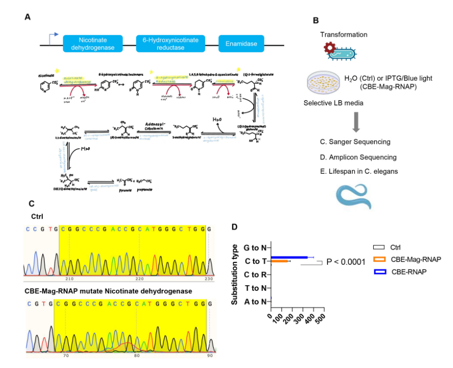 Figure6. Application of the second-generation black box on the nicotinate degradation pathway in E. coli. A, Nicotinate degradation pathway in E. coli. B, Schematic processing. C, Sequencing results of plasmids from the control and experimental groups. D, Statistical analysis of the proportions of different types of random mutations. E, Statistical analysis of lifespans of the control and experimental groups.
