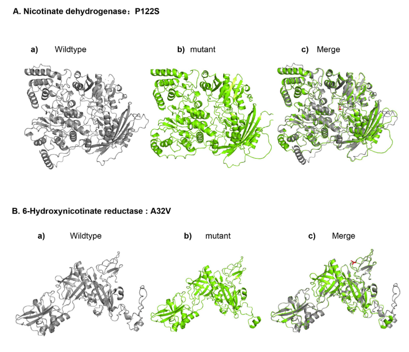 To further explain the top mutations that improve nicotinate degradation, we performed protein structure analysis using AlphaFold3. As shown in Figure 7, the P122S mutation in nicotinate dehydrogenase, along with the A32V mutation in hydroxynicotinate reductase, are beneficial compared to the non-mutated group, indicating functional mutations that enhance the system's ability to degrade nicotinate.