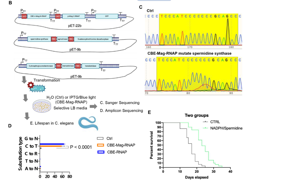 Figure4. Application of the second-generation black box on the pentose phosphate pathway (PPP) and polyamine synthesis pathway in E. coli. A, Pentose phosphate pathway (PPP) and polyamine synthesis pathway E. coli. B, Plasmids for spermidine synthesis (spermidine synthase - S-adenosylmethionine decarboxylase - agmatinase) and NADPH synthesis (6-phosphogluconolactonase - transaldolase - transketolase). C, Sequencing results of plasmids from the control and experimental groups. D, Statistical analysis of the proportions of different types of random mutations. E, Statistical analysis of lifespans of the control and experimental groups.