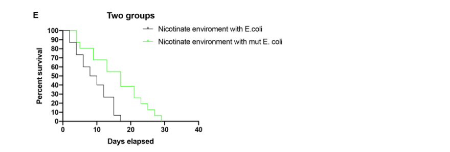 Considering the toxicity of nicotine and the fact that nicotinate is the substrate for generating nicotine, we constructed a bio-brick containing three enzymes: nicotinate dehydrogenase, 6-hydroxynicotinate reductase, and enamidase (Figure 6A). We applied the second-generation black box approach to enhance the degradation of nicotinate in E. coli. By randomly mutating and screening key enzymes in these metabolic pathways (as shown in Figure 6B), we hypothesized that we could increase the degradation of nicotinate on an LB plate. We then performed Sanger sequencing on nicotinate dehydrogenase, resulting in a successful mutation, as shown in Figure 6C. However, Sanger sequencing did not reveal mutations with low frequencies. We subsequently conducted next-generation sequencing on bacteria with multiple mutations. As shown in Figure 6D, the next-generation sequencing results indicated a significant increase in C to T mutations in the nicotinate dehydrogenase gene. To further confirm that these mutations in E. coli can protect C. elegans from high concentrations of nicotinate, we performed a lifespan assay, demonstrating that the mutant E. coli significantly protected C. elegans (Figure 6E).