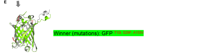 At the same time, in order to compare the differences in mutation frequencies caused by the second-generation black box (CBE-Mag-RNAP) and the first-generation black box (CBE-RNAP), we transformed the two plasmids separately into E. coli BL21, and added continuously expressed mCherry as an internal control (as shown in Figure 3A). We set up a control group (where the addition of water prevented the black box from activating mutations), a second-generation black box group (where IPTG was added and placed under blue light to activate mutations), and a first-generation black box group (where IPTG was added to activate mutations). We then performed fluorescence-activated cell sorting (FACS) on the three groups based on the fluorescence intensities of GFP and mCherry, and sorted out the cell populations with increased and decreased fluorescence intensities (as shown in Figure 3B). The results (as shown in Figure 3C) revealed that the proportion of cells with increased fluorescence intensity in the second-generation black box group (14.78%) was significantly higher than in the first-generation black box group (3.42%) and the control group (11.95%). This indicates that the second-generation black box significantly enhanced the mutation frequency compared to the first-generation black box, and the majority of the mutations were C-to-T substitutions (as shown in Figure 3D). We inferred that the significant mutations caused by the second-generation black box may have substantially altered the aggregation ability of the GFP, leading to the changes in fluorescence intensity (as shown in Figure 3E). Here, we concluded that GFP with mutations T10I, S29F, A155V are the top ranked which may accelerate the combination and assembly between GFP proteins.